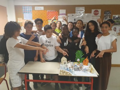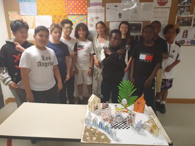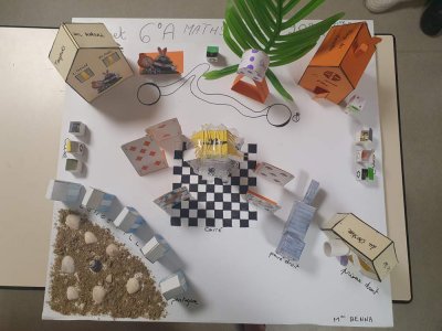 Projet interdisciplinaire maths français anglais des 6emes A : En français ils ont étudié "Alice au pays des merveilles " et ils s’en sont inspirés pour construire une maquette utilisant les connaissances sur les solides en mathématiques et la proportionnalité. Ils ont même découvert les nombres premiers grâce à ce conte sachant que l’auteur était un professeur de mathématiques. Ils ont eu l’idée d’intégrer les poubelles de recyclage en référence aux Eco délégués et d’y placer la plage de Longeville : leur voyage du début d’année.
